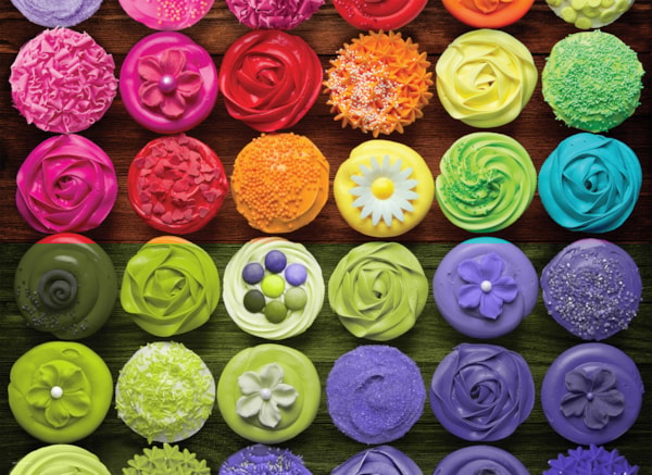 - Cupcake to mały ciastko zaprojektowane dla jednej osoby, które może być pieczone w małej, cienkiej papierowej lub aluminiowej foremce. Podobnie jak przy większych ciastach, na cupcake'y można nakładać lukier i inne ozdoby ciastka, takie jak owoce i słodycze. Ten kolorowy obrazek do układania puzzli przedstawia jasno udekorowane cupcake'y w tęczowym wzorze.