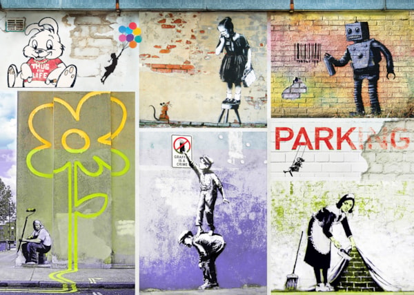 - Banksy es, posiblemente, el artista callejero más controvertido del mundo y sus obras se han convertido en una subcultura por derecho propio. Las declaraciones políticas y la visión disruptiva de Banksy han tenido un impacto en ciudades de todo el mundo en momentos vitales de la historia moderna, provocando puntos de vista alternativos y fomentando la revolución en el mundo del arte. Su identidad sigue siendo desconocida, incluso después de más de 30 años de participación en la escena global del graffiti. Ha trabajado en muchos medios y estilos de arte callejero, rompiendo las barreras y expectativas de los críticos del arte callejero. Sus obras incluyen imágenes poderosas y a menudo controvertidas, fomentando la rápida difusión de su nombre y su trabajo en internet. Hoy en día, sus obras icónicas han sido compartidas y reutilizadas sin medida.
