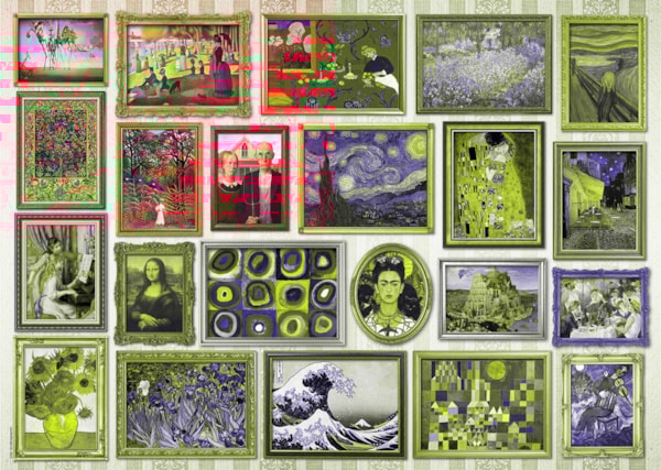 - Ten kolaż przedstawia zbiór obrazów znanych artystów, takich jak Van Gogh, Monet, Klimt, Morris, Da Vinci, Hokusai, Seurat, Kandinsky, Chagall i inni.