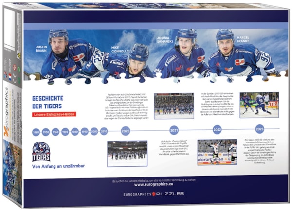 Poczuj emocje hokeja na lodzie dzięki puzzlom Straubing Tigers od Eurographics, składającym się z 1000 elementów! Świętuj pasję i energię Straubing Tigers, którzy unoszą się nad malowniczym placem miejskim w Straubing na dynamicznym obrazie.