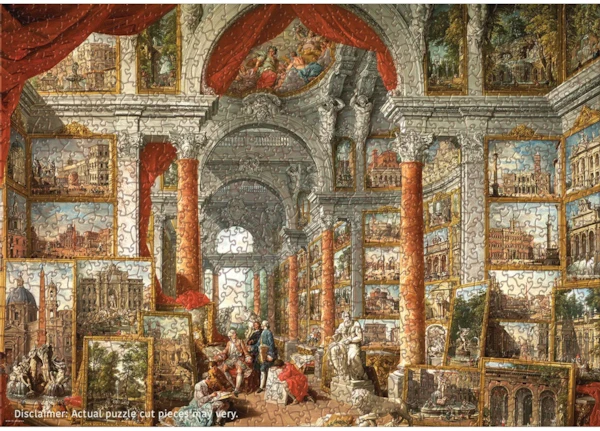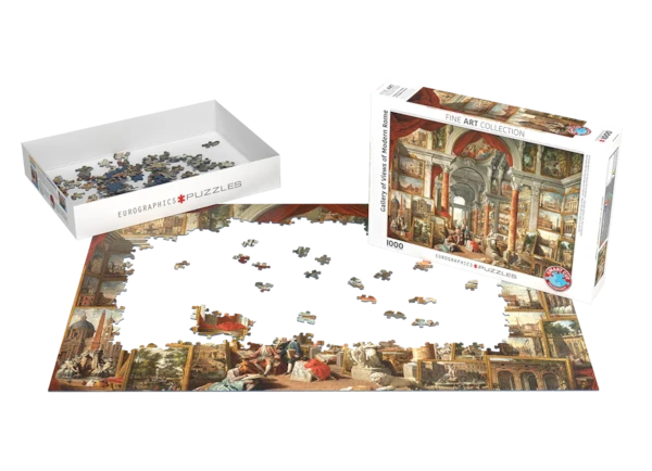 Bring the splendor of Rome to life with the Eurographics 1000-piece puzzle, Gallery of Views of Modern Rome, showcasing the exquisite artistry of Giovanni Paolo Panini. This intricate masterpiece captures the grandeur of 18th-century Rome, filled with majestic columns, stunning architectural landmarks, and an array of detailed cityscapes framed in an opulent gallery setting.
