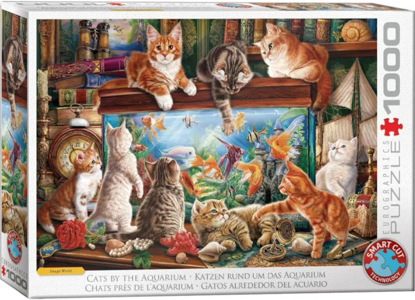 Bring a burst of whiskers, bubbles, and bright colors to your table with Cats by the Aquarium, a 1000-piece jigsaw puzzle that cat lovers will adore. A group of curious kittens gathers around a sparkling aquarium, mesmerized by shimmering goldfish and exotic tropical fish. From fluffy tabbies on the bookshelf to a brave paw dipping toward the water, every corner of the scene is packed with playful details to discover.