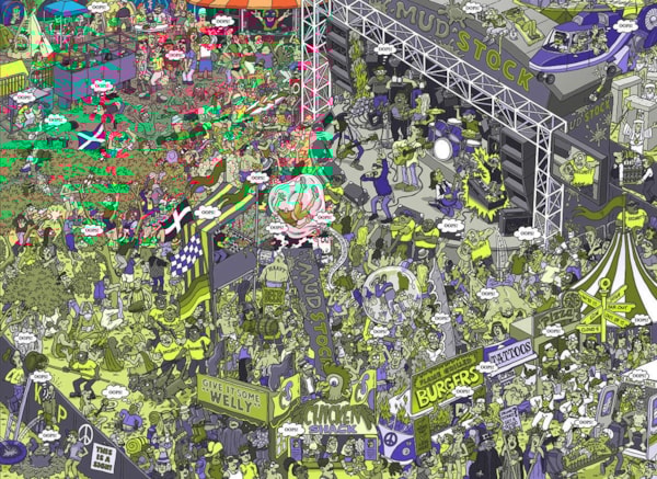 Duże kawałki- Oops! - karykaturalne dzieło sztuki autorstwa Martina Berry'ego, to zabawny obraz festiwalowej sceny, na której dzieją się różne incydenty w parku.
