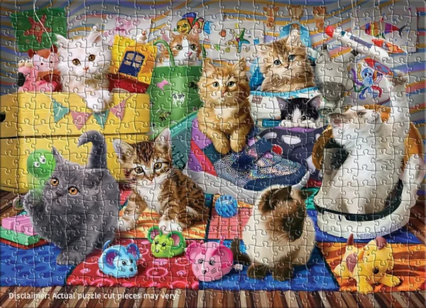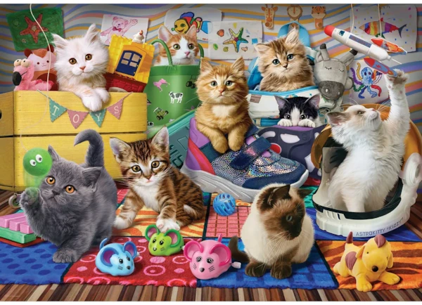 Enjoy a burst of playful charm with the Eurographics 500-piece puzzle Kittens Playtime. This lively scene captures a room full of curious kittens exploring colorful toys, cozy baskets, and cheerful drawings on the walls. Every corner is filled with whiskered expressions, fluffy textures, and delightful surprises that make assembling the large, easy-to-handle pieces a true pleasure.