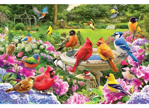 Celebrate the beauty of nature with the Eurographics 2000-piece puzzle Bird Gathering. This vibrant scene invites you into a lush garden where cardinals, blue jays, goldfinches, and many other colorful birds meet around a graceful fountain. Rich blossoms, leafy greenery, and delicate details create a peaceful atmosphere that feels alive with song. The large 2000-piece format offers an engaging challenge for puzzle lovers who enjoy wildlife and botanical art.