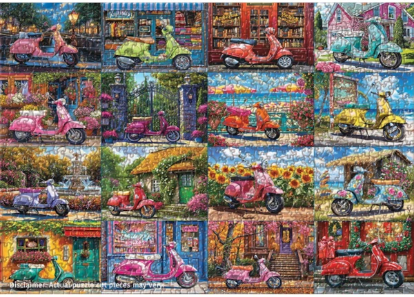 Adéntrate en un mundo de colores vibrantes y encanto retro con el Rompecabezas de 1000 Piezas 16 Scooters de Eurographics, con impresionantes ilustraciones de Bigelow Illustrations. Este llamativo rompecabezas presenta 16 Scooters bellamente detallados, cada uno ambientado en paisajes pintorescos y variados, desde playas bañadas por el sol y encantadoras calles de pueblo hasta campos de girasoles en flor y acogedores cafés de estilo europeo. Cada scooter destaca con su color, estilo y entorno únicos, ofreciendo un encantador recorrido por diferentes estaciones y paisajes escénicos.