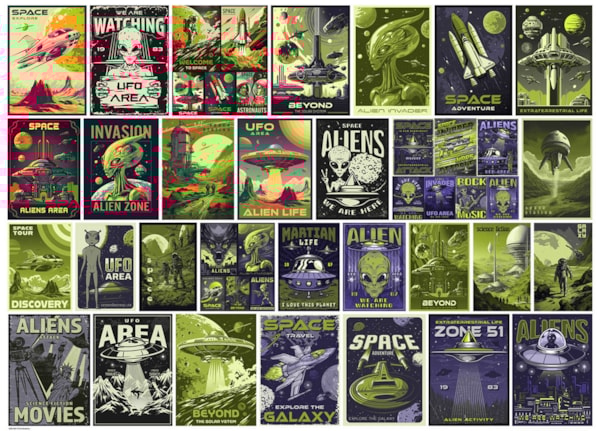 Sumérgete en el mundo retro-futurista de las aventuras alienígenas con el rompecabezas de 1000 piezas Pósters Vintage de Alienígenas de Eurographics. Esta colección ecléctica de nostálgicos carteles de ciencia ficción, con diseños atrevidos y colores vibrantes, celebra la imaginación de la vida extraterrestre y los temas clásicos de exploración espacial.