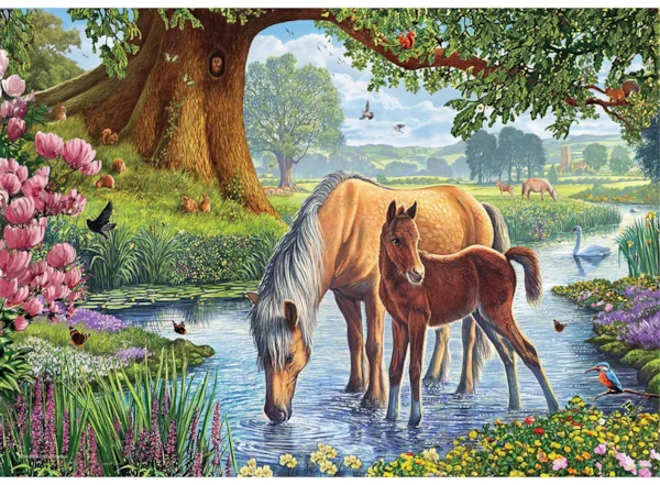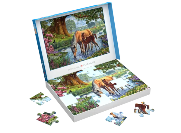 Un ruisseau de campagne paisible se transforme en scène de conte alors qu’une ponette Fell et son poulain s’abreuvent sous un vieux chêne. Oiseaux, papillons et fleurs sauvages créent un décor rempli de petits détails à découvrir. Le puzzle cognitif Connecting Pieces™ de 24 pièces offre des pièces extra épaisses faciles à manipuler, avec l’image complète imprimée à l’intérieur du couvercle pour guider l’assemblage. Une activité apaisante et valorisante pour 5 à 99 ans — on assemble et on range directement dans la boîte.