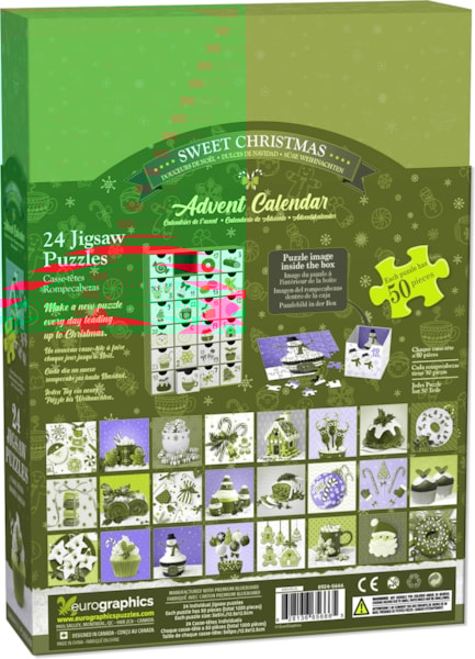 Préparez-vous à célébrer la période la plus sucrée de l'année avec le calendrier de l’Avent Douceurs de Noël de Eurographics ! Ce calendrier enchanteur contient 24 mini puzzles, chacun composé de 50 pièces, révélant des images joyeuses de gourmandises festives, maisons en pain d'épices, cupcakes et bien plus ! Chaque jour avant Noël, ouvrez un tiroir et assemblez un puzzle mettant en scène une délicieuse douceur.